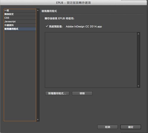 - 中繼資料和檢視應用程式 (轉存): 現在,您可以在「可重排/固定版面」標籤中,更新 InDesign 檔案和填入的同個 EPUB 資料的檔案資訊或中繼資料。在「可重排版面」和「固定版面」的 EPUB 轉存選項中,都已可用新的「檢視應用程式」標籤。現在,InDesign 會顯示可對應開啟 EPUB 檔案的應用程式。