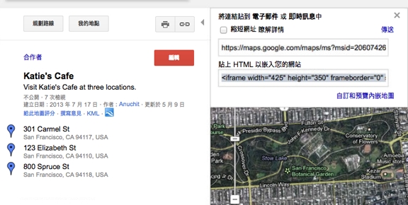此原始碼是從 maps.google.com 網站拷貝的。您可以建立通往單一地址的自訂地圖 (本範例中是多個地點)。這是免費的服務,您只需提供一個地址 (或多個地址) 再按一下「建立地圖」按鈕即可。