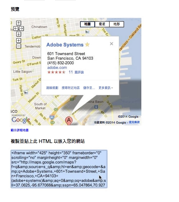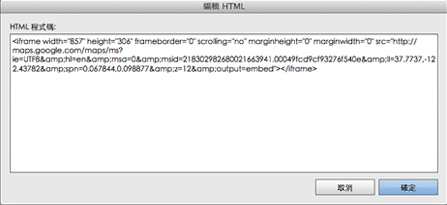 從 Google 視窗拷貝產生的 HTML。或者,如果您不想產生您自己的 Google 地圖程式碼,您可以直接拷貝以下原始碼: