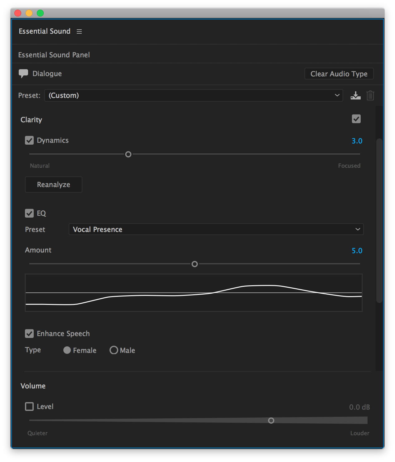 Once you assign an audio type, the Essential Sound panel presents you with several parameter groups. These groups allow you to carry out the common tasks associated with dialogue, such as unifying the different recordings to a common loudness, reducing background noise, and adding compression and EQ.