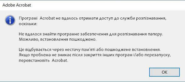 Під час спроби виконати оптичне розпізнавання символів (OCR) на відсканованій сторінці або в зображенні в програмі Acrobat може виникнути проблема з отриманням доступу до служби OCR через недостатню системну пам’ять, неповні / пошкоджені файли, непідтримувані формати, застаріле програмне забезпечення чи невідповідні ресурси. Acrobat відображає таку помилку: «Acrobat не вдалося отримати доступ до служби розпізнавання, тому що не вдалося знайти службу розпізнавання зображень».