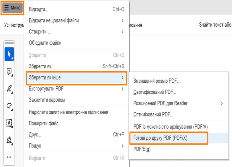 Відкрийте PDF-файл в Acrobat і виберіть гамбургер-меню (Windows) або меню Файл (macOS) > Зберегти в іншому форматі > Готові до друку PDF (PDF/ X).