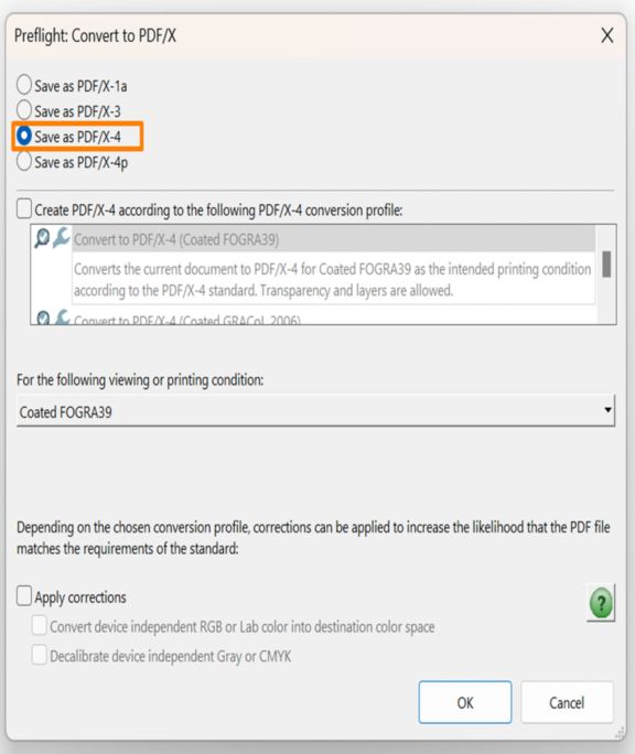 У діалоговому вікні Preflight виберіть параметр Зберегти як PDF/X-4 і натисніть ОК