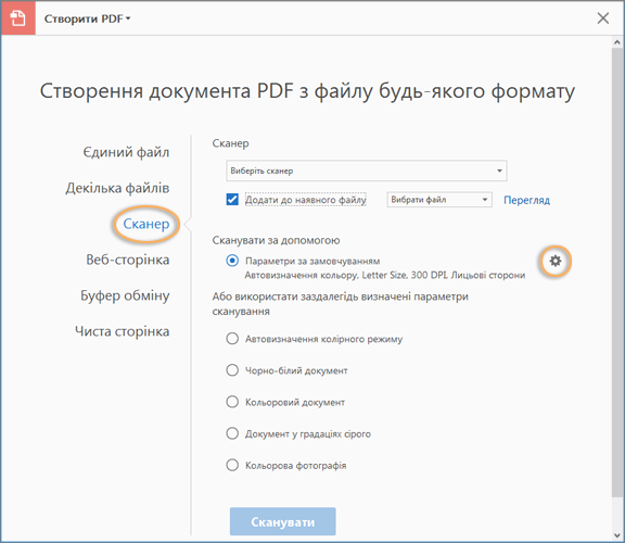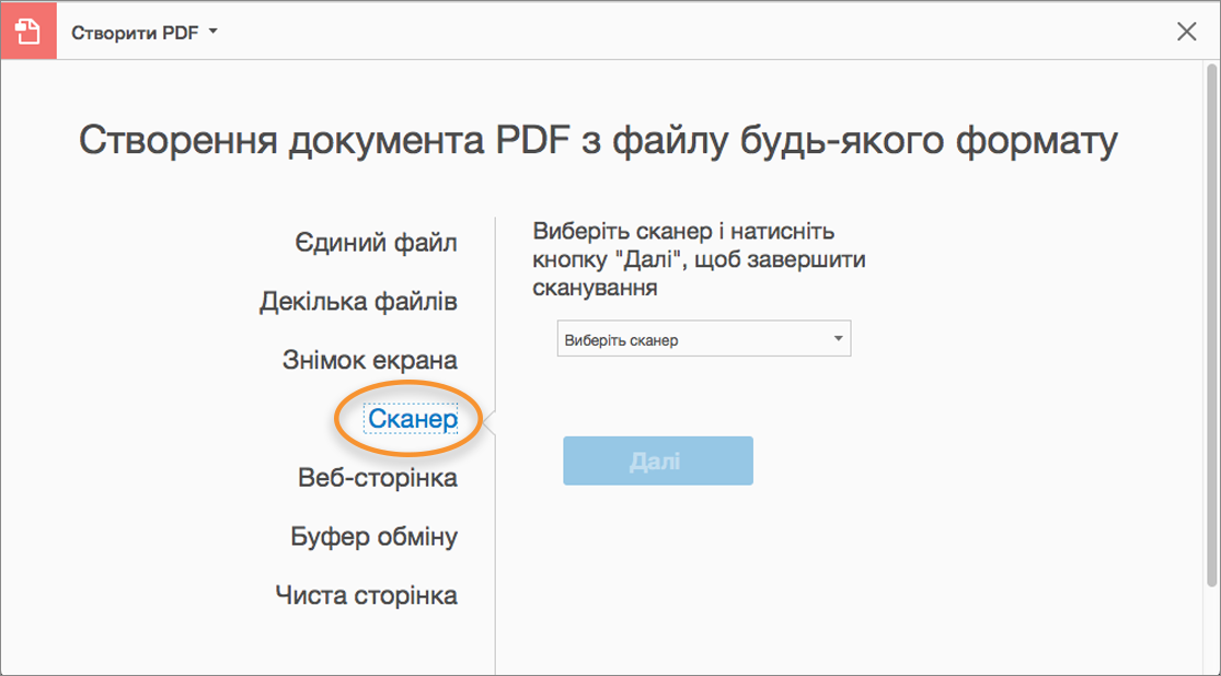 У Windows можна сканувати паперовий документ у PDF за допомогою принтера або сканера з Acrobat.Якщо ваш сканер має драйвер WIA, натисніть кнопку Сканувати, виберіть Adobe Acrobat зі списку, а потім виберіть свій сканер і попередньо встановлений або Користувацьке сканування в Acrobat.