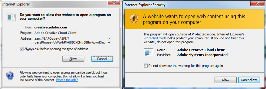 In Internet Explorer, you see one or two dialogs asking if you want to allow the website to open a program.