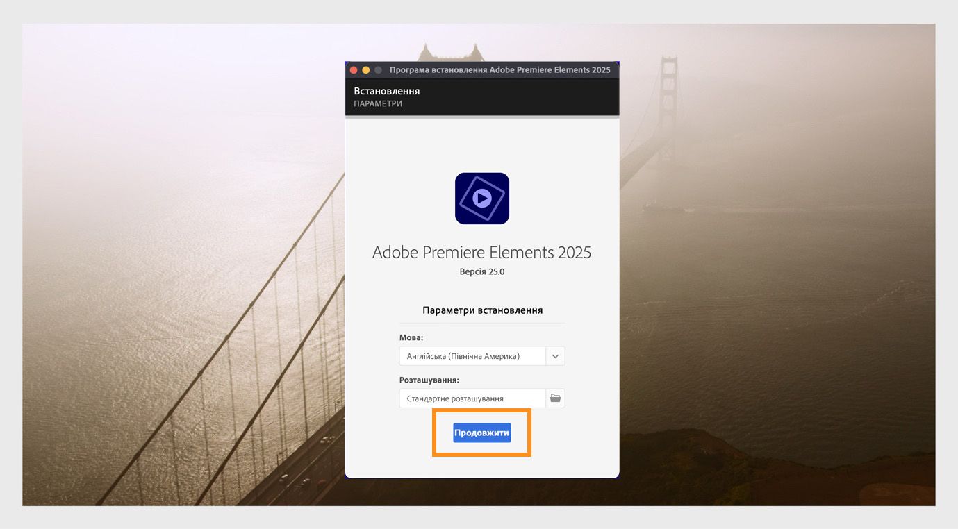 - macOS: Перейдіть до Adobe Premiere Elements <year> > Install.app і запустіть інсталятор. Введіть системний пароль, якщо з’явиться відповідний запит.