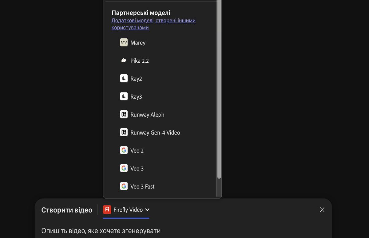 Генерувати зображення й відео за допомогою програм Adobe і партнерських моделей, щоб досліджувати творчі ідеї та коригувати результати.