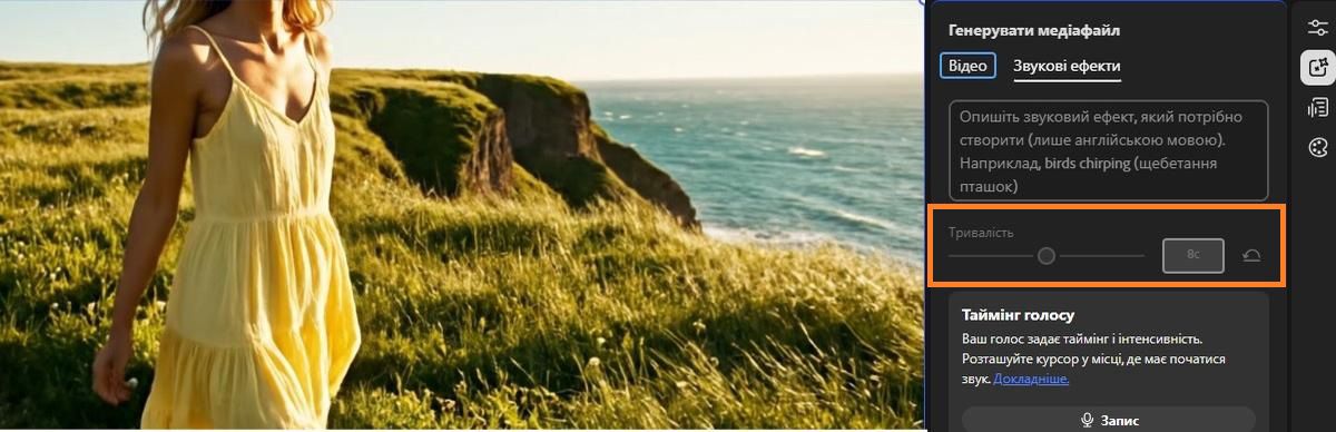 Пересуньте повзунок Тривалість до потрібного значення, щоб налаштувати тривалість згенерованого аудіо, або клацніть значок скидання , щоб повернути стандартну тривалість.