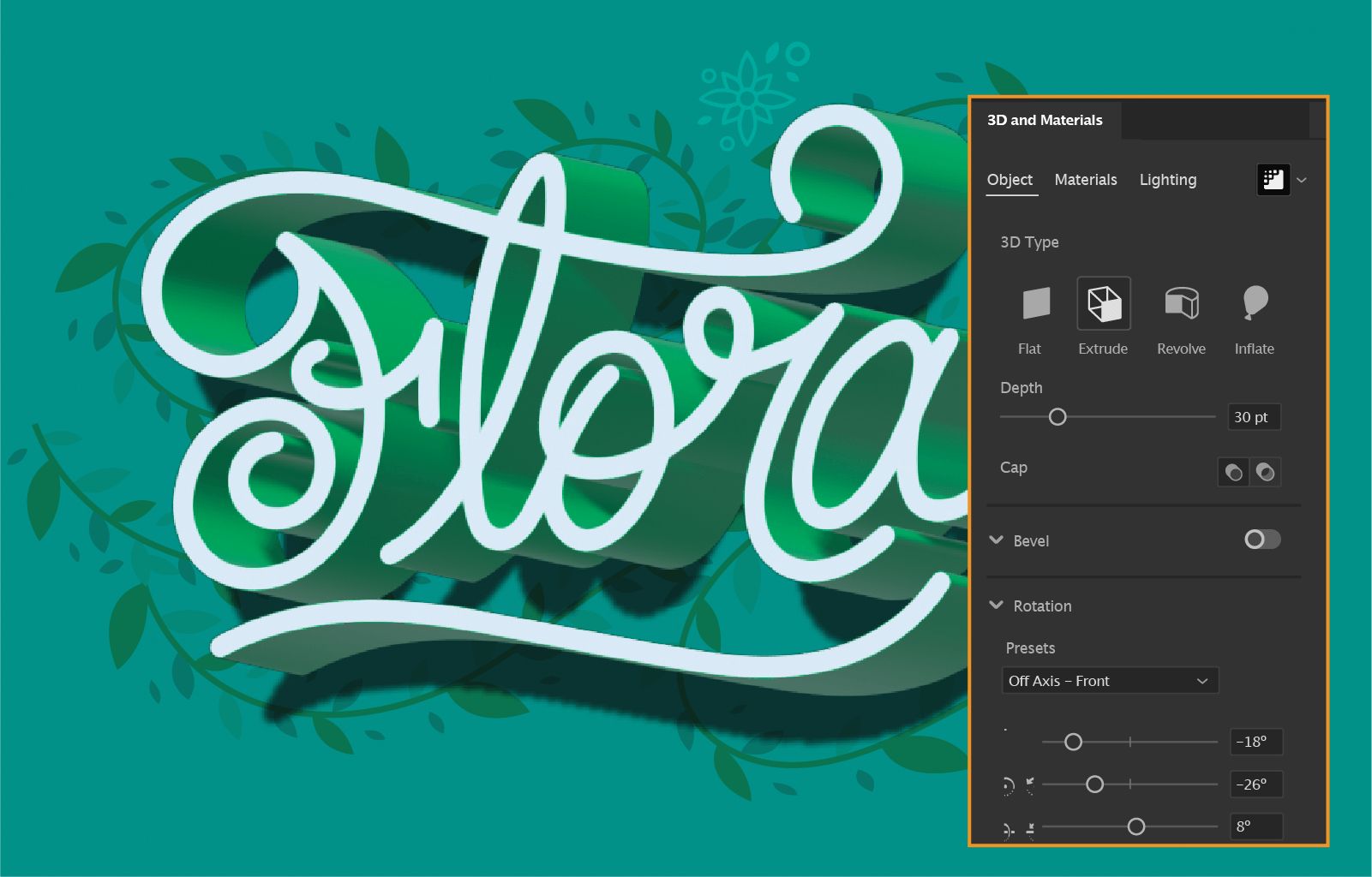 Тепер, коли ви дізналися про всі доступні 3D-ефекти й матеріали в розділі вище, ви можете застосовувати ефекти «Витягування», «Обертання», Матеріали Adobe Substance, «Освітлення», «Інтенсивність» і «Тіні» до імпортованої векторної ілюстрації.