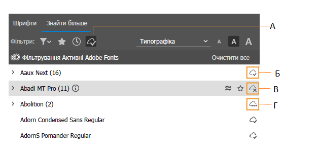 На вкладках Ваші шрифти та Знайти ще представлено різні інструменти, які допоможуть вам знайти шрифт, що відповідає вашим дизайнерським вимогам.