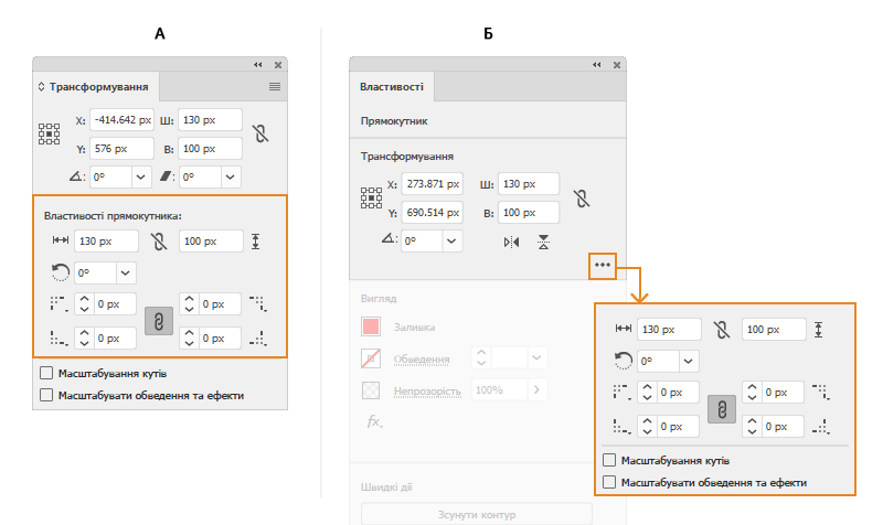 - Радіус кута: забезпечує пропорційне змінення або введення абсолютного значення на панелі «Трансформування» для кожного з кутів прямокутника.