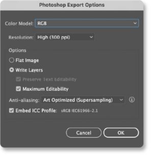 Ви можете використовувати формат PSD для експорту файлів Illustrator у Photoshop, який зберігає шари, роздільну здатність й колірні профілі.