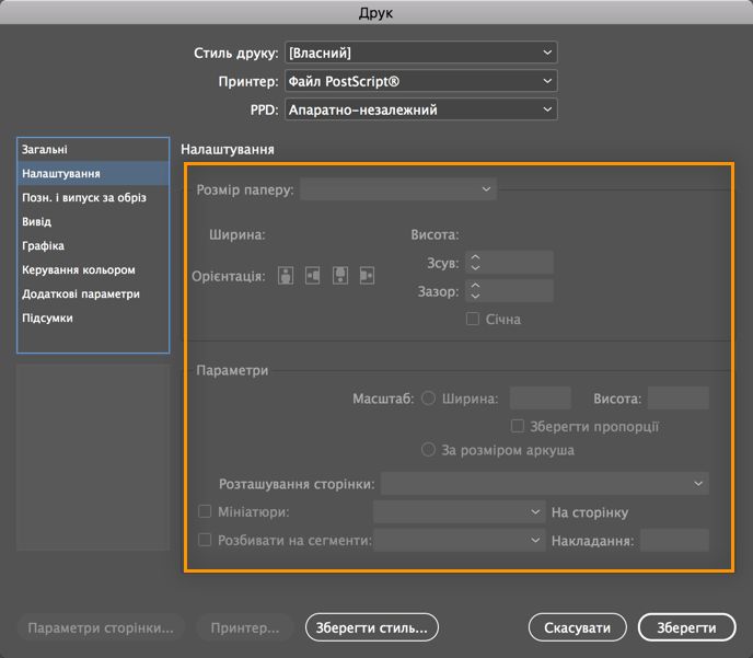 Під час друку документа InDesign як файлу PostScript параметри налаштування сторінки вимкнено.