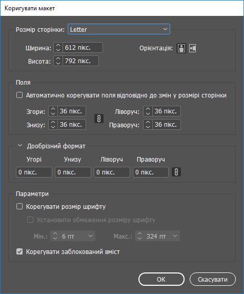 Задайте такі параметри в діалоговому вікні Коригувати макет: