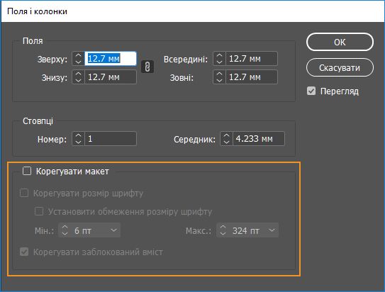 У діалоговому вікні «Поля і колонки» виберіть «Коригувати макет». За замовчуванням у цьому полі прапорець відсутній.