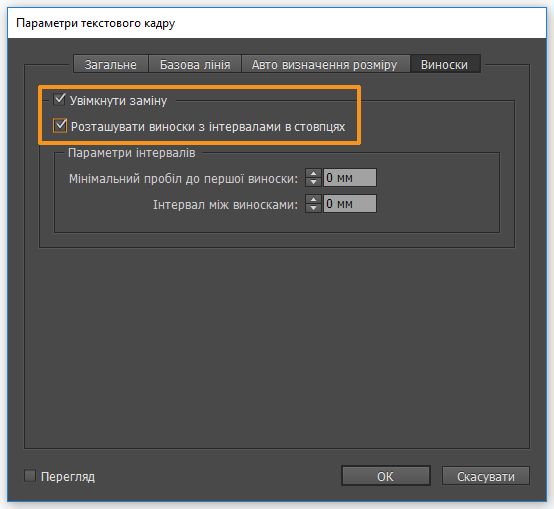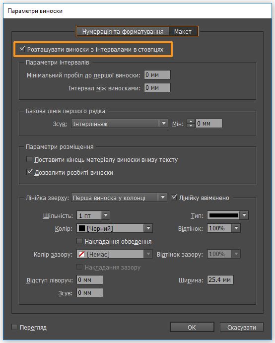 Установіть позначки біля пунктів «Увімкнути заміну» і «Розташувати виноски з інтервалами в стовпцях».