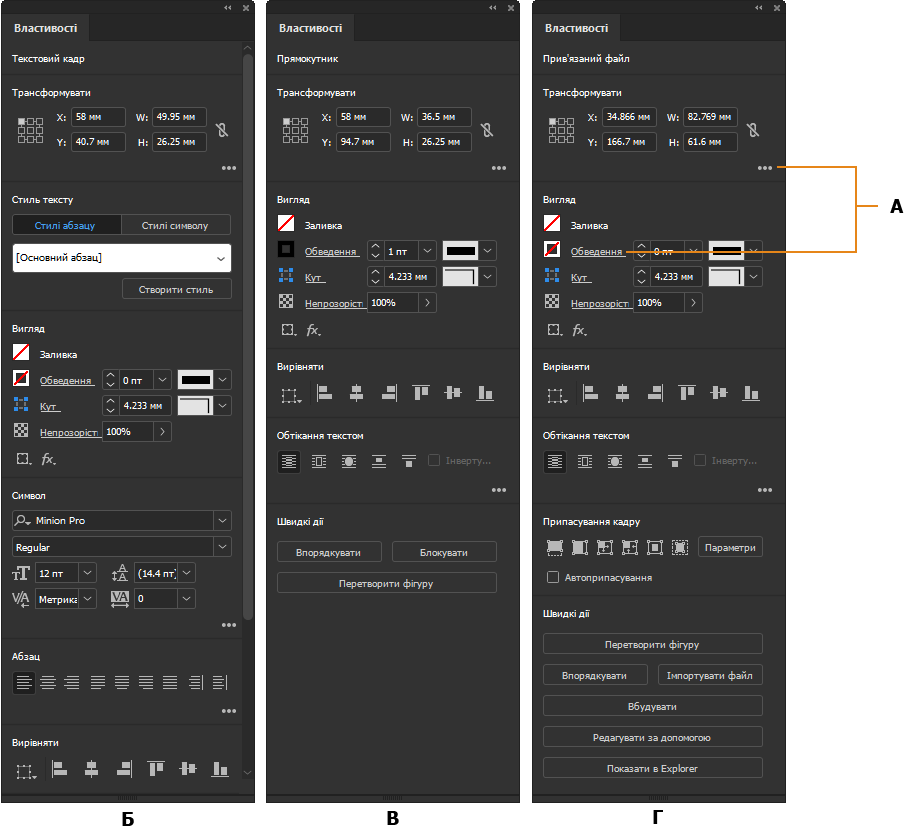 На панелі «Властивості» в InDesign можна переглядати налаштування та елементи керування, що залежать від контексту поточного завдання або процесу. Ця нова панель має полегшити роботу в програмі й забезпечити зручний доступ до елементів керування в потрібний момент.