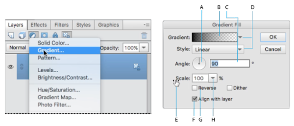 Some panels and dialog boxes contain settings that use pop‑up sliders (for example, the Opacity option in the Layers panel). If there is a triangle next to the text box, you can activate the pop‑up slider by clicking the triangle. Position the pointer over the triangle next to the setting, hold down the mouse button, and drag the slider or angle radius to the desired value. Click outside the slider box or press Enter to close the slider box. To cancel changes, press Esc.