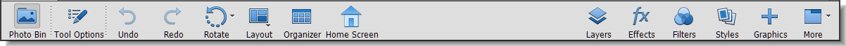 At the bottom of the Photoshop Elements, the taskbar displays buttons for the most frequently used panels and operations performed while editing and modifying images. You can use the Photo Bin and Tool Options buttons to toggle between displaying thumbnails and tool options. You can quickly undo and redo operations, rotate images, or change the layout. You can also click the Organizer button to start Photoshop Elements Organizer. The Home Screen button give you access to the home screen. In the Expert mode, click the arrow beside the More button, to see the option to toggle between Basic and Custom workspaces.