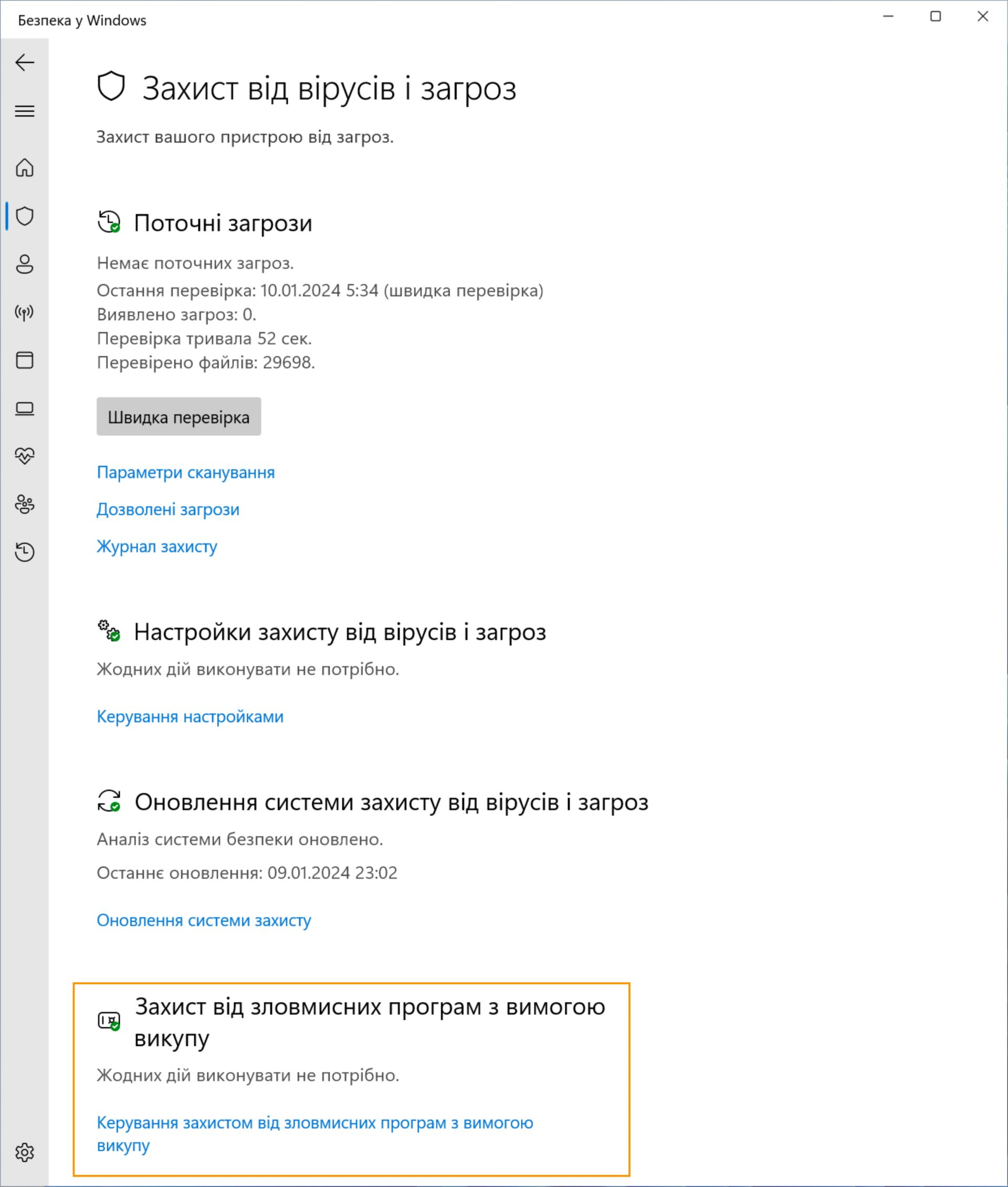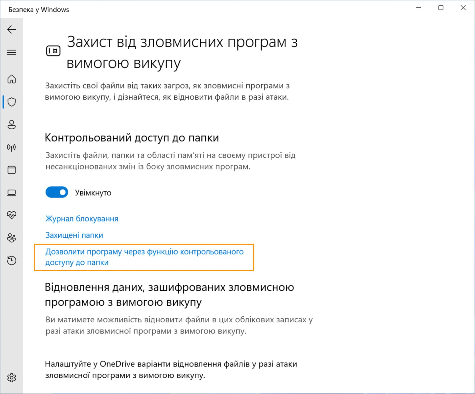 У розділі «Захист від вірусів і загроз» виберіть Захист від зловмисних програм з вимогою викупу.