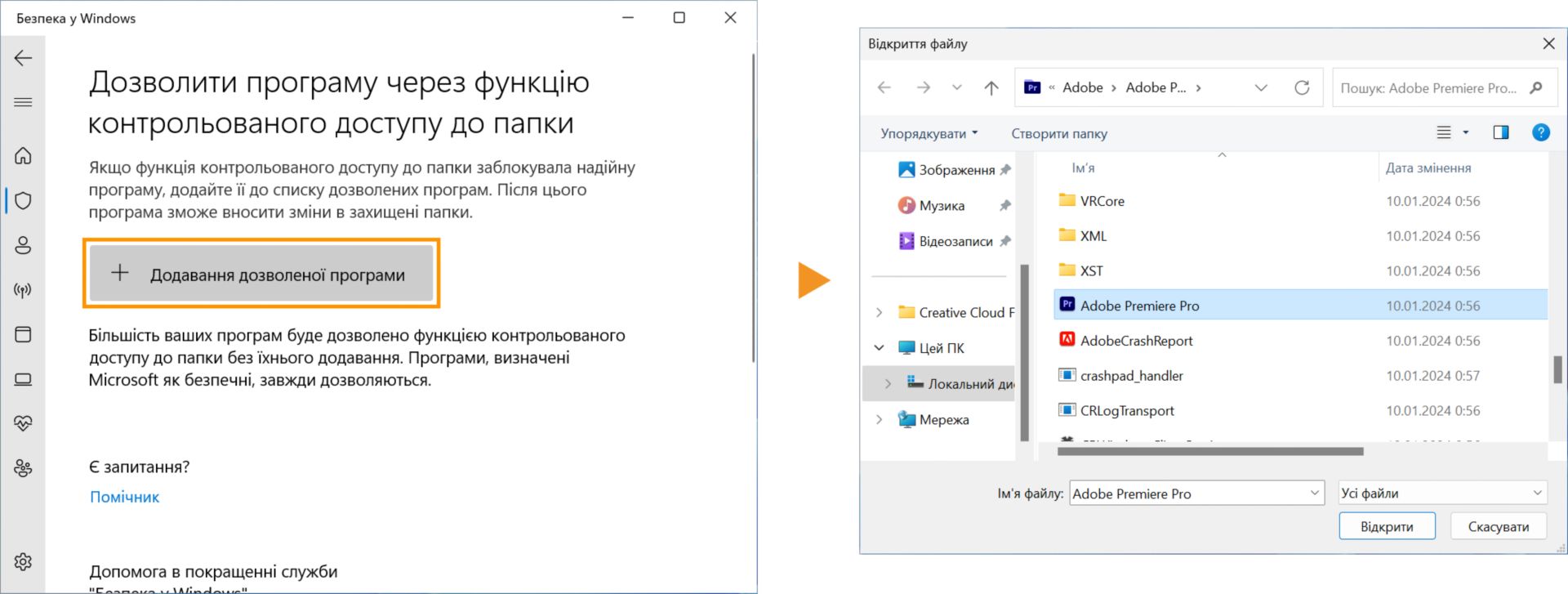 Щоб запустити Premiere Pro, Adobe Media Encoder або After Effects, коли ввімкнено функцію контрольованого доступу до папки, виконайте наведені нижче дії.