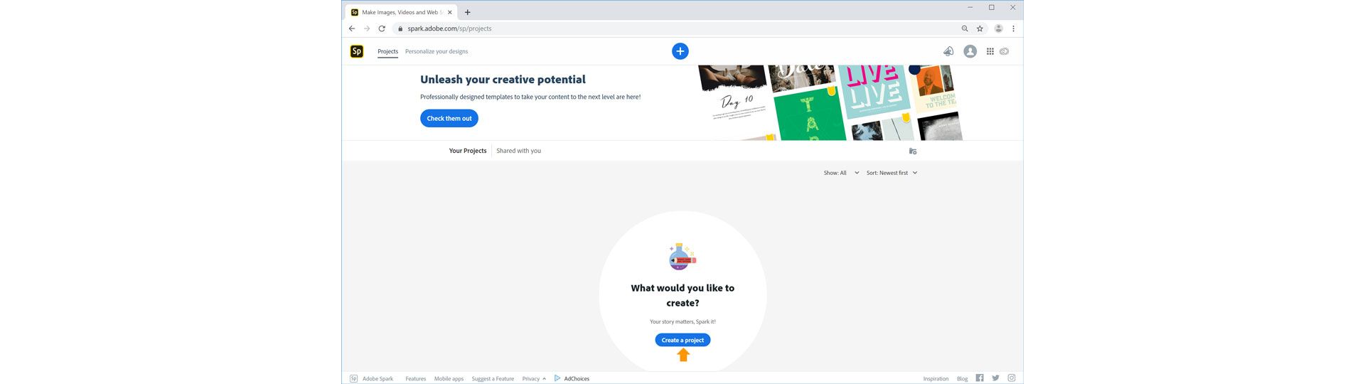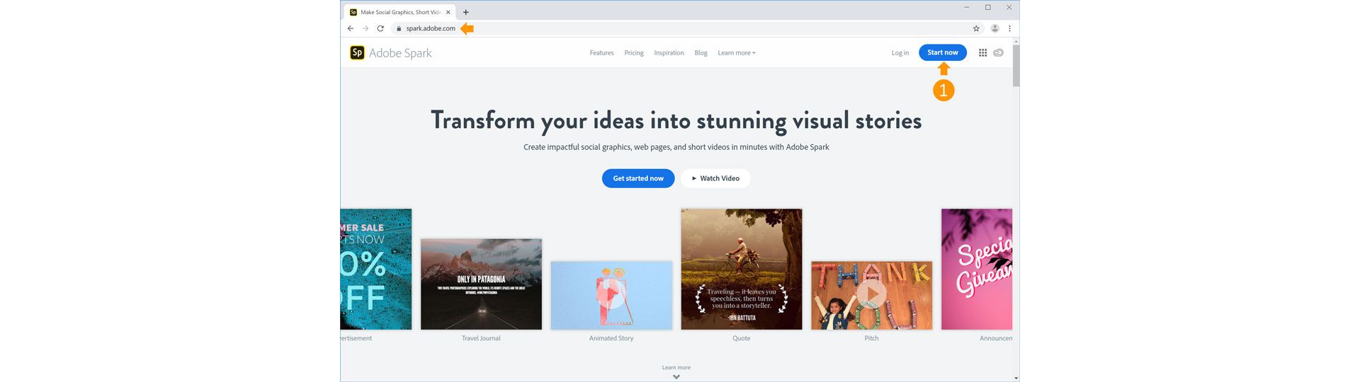 1. Open Adobe Spark in your web browser (https://spark.adobe.com) and click on the Start now button. Log in with your Adobe ID or choose any of the other log in options.
