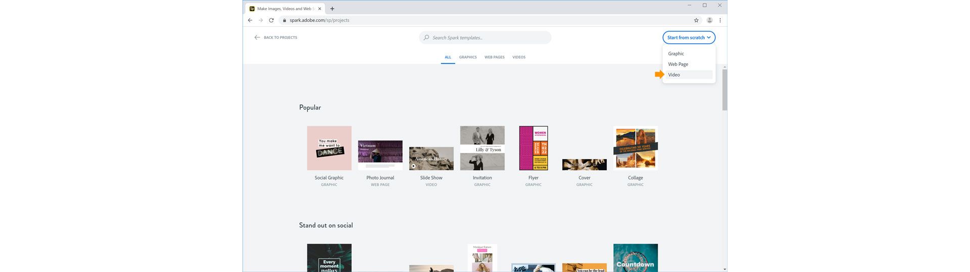 2. On your Projects page, click on the Create a project button. Spark will offer you some templates you can use as a starting point. As we want to start with an empty project, click on the Start from scratch button on the upper right corner, then select Video from the dropdown menu.