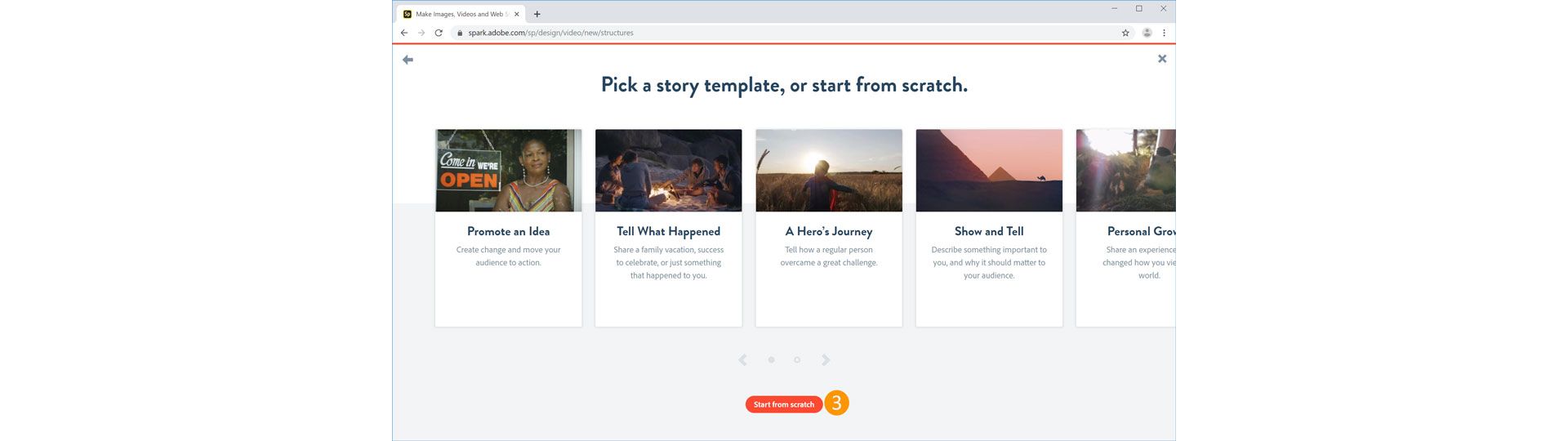 3. You can click Skip when Spark prompts you to enter your story idea as this is an option only. On the bottom of the page, click on Start from Scratch to start a new empty video project.