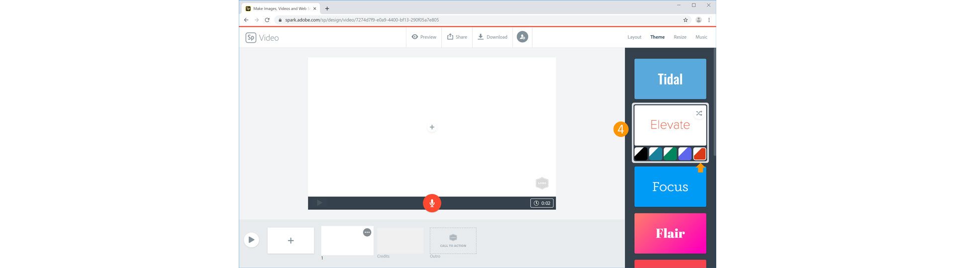 4. Before you start editing the video content, choose a general layout theme. Click Theme on the top right, then choose Elevate as the theme and select red as text color from the color swatches.