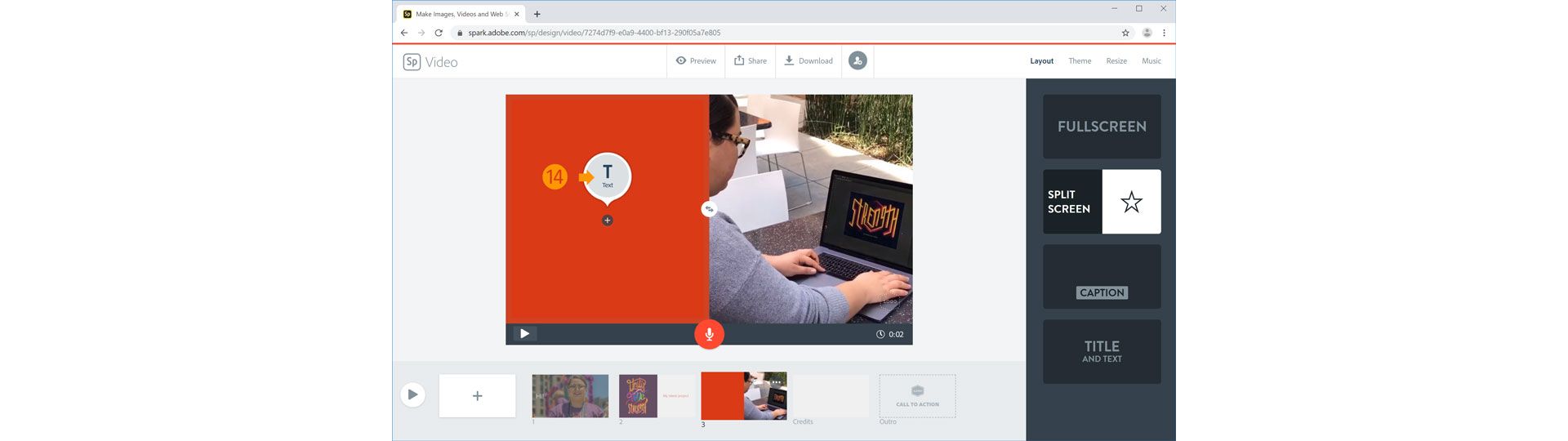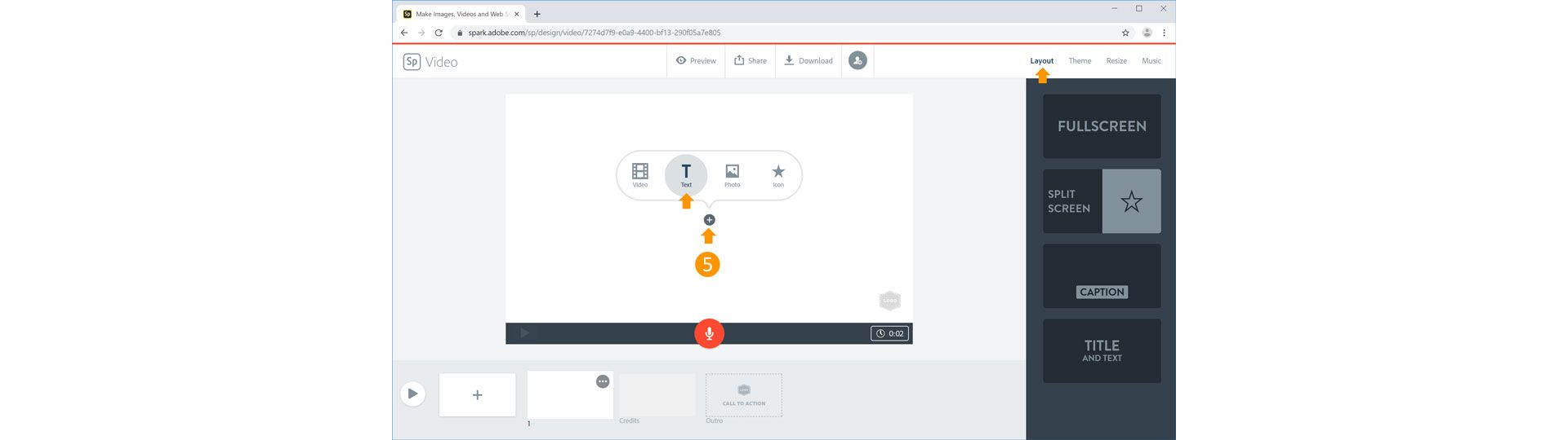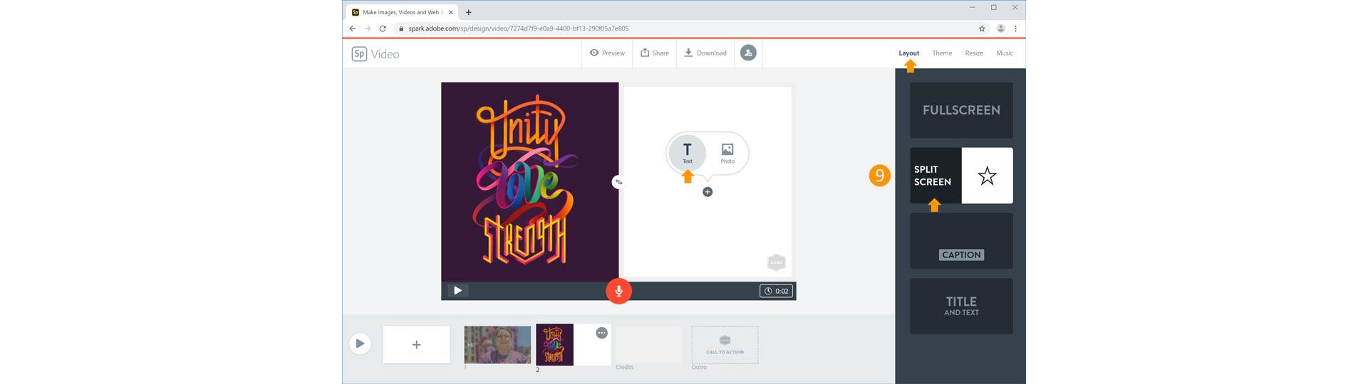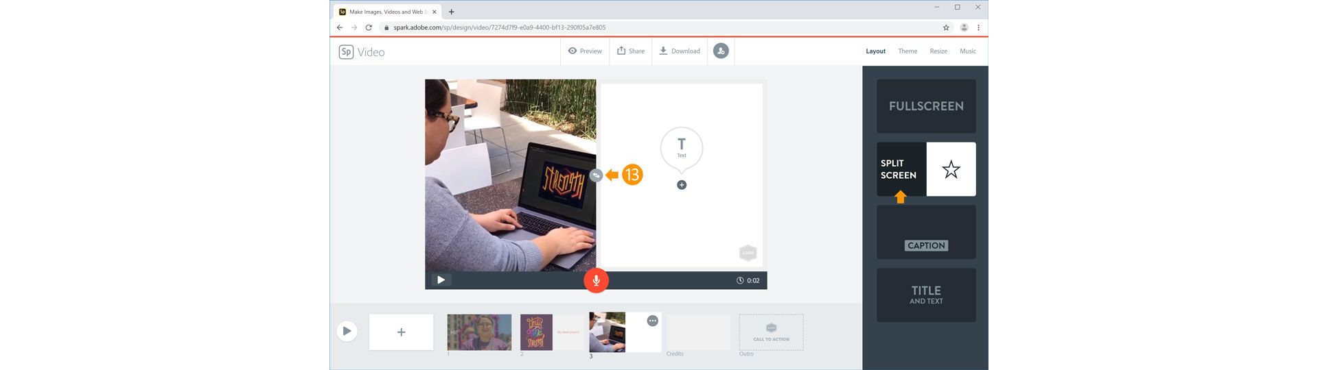 13. Click on SPLIT SCREEN from the layout menu, then find the double arrow icon between video and text and click on it to swap items.