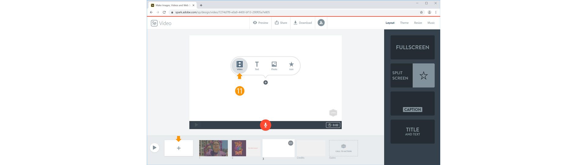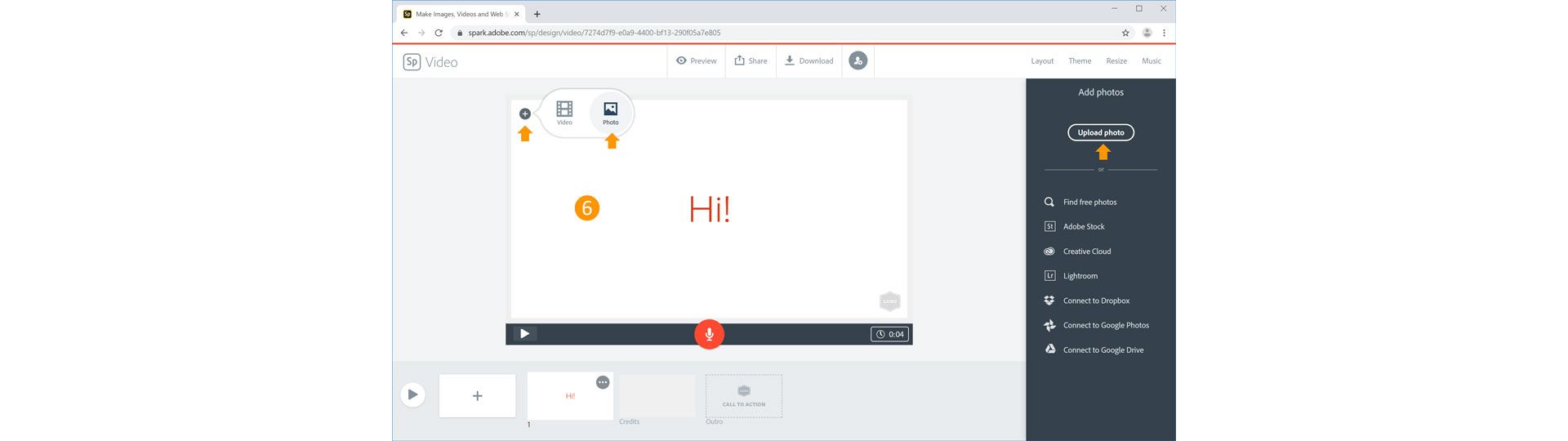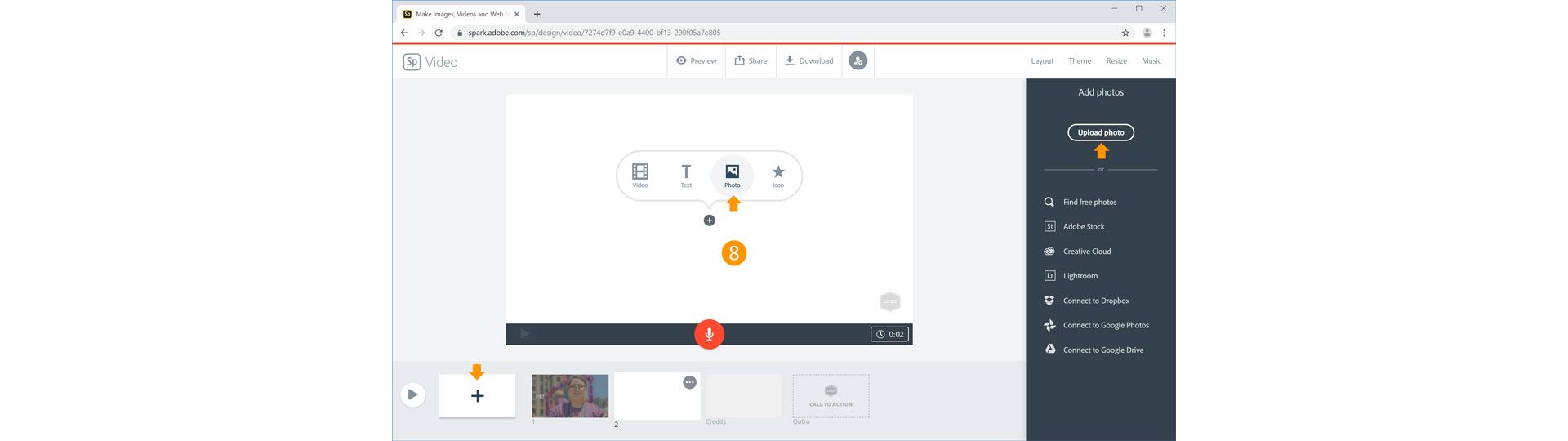 8. On the video timeline at the bottom of the page, click the + button right next to the play button to create another video sequence. Chose Photo from the menu on the preview window, then Upload Photo and choose image 02.jpg from your practice files.