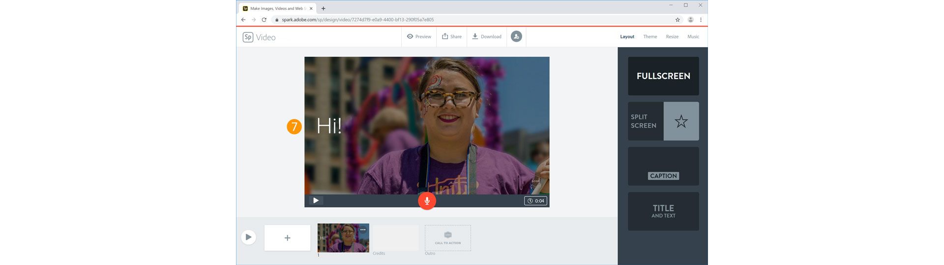 5. Add text: Return to the initial work mode by clicking on Layout. Click the + icon in the middle of the preview window, then choose Text. Type in "Hi!". This will be the first screen your video starts with.
