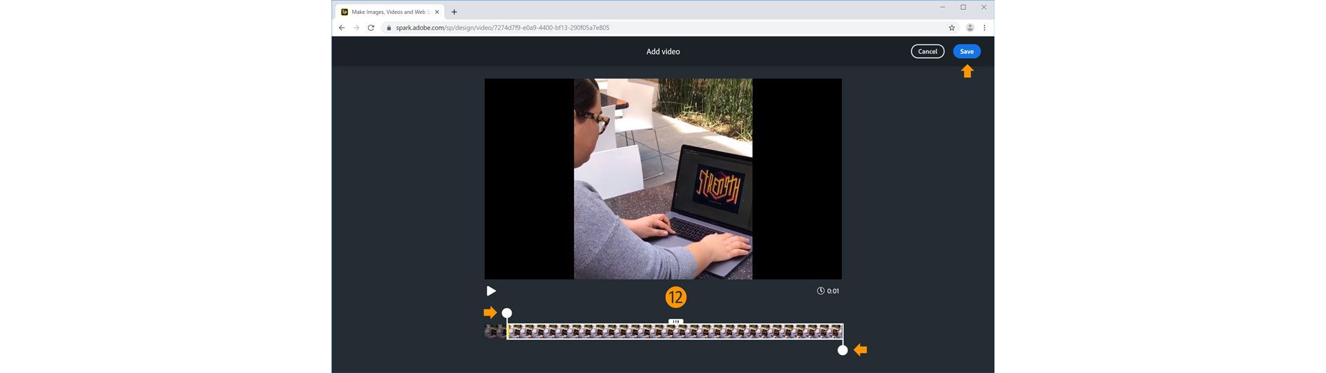 12. On the next screen you can trim your video before uploading it. You can also set a new start and end point of your video by clicking and dragging the handles on the video timeline, then click Save.