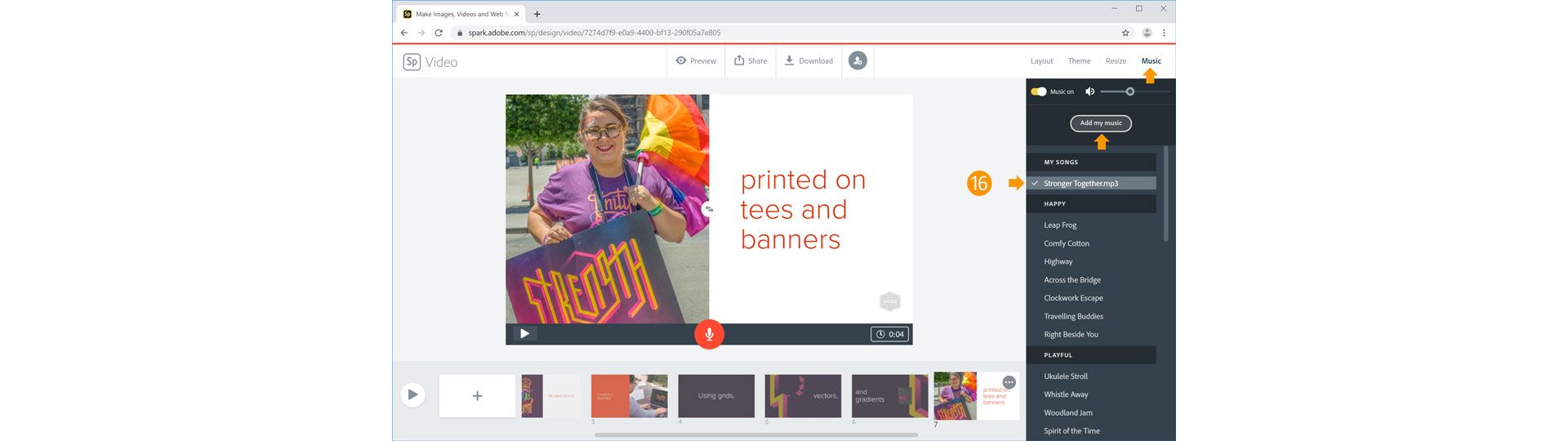 16. Select Music on the top right menu. Click on the Add my music button, then browse the practice files and choose Stronger Together.mp3.