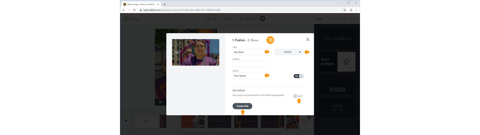 18. Click the Share button on the top menu, pick a category, find a title and enter your name into the Author field. Turn off the Get Noticed switch (or keep it on if you are publishing your own story). Finally click on the Create link button to publish your video. Now you can copy and share the public link of your video or choose from one of the other sharing options.