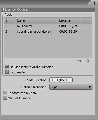 Create a slide show, and import one or more audio clips as assets in the Project panel.