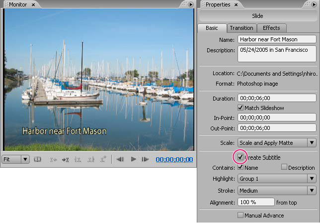 In the Properties panel, click the Basic tab, and select Create Subtitle.