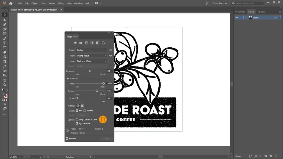 11. Set Paths to 100%, Noise to 1px, uncheck Snap Curves to Lines, check Ignore Whites, and check Preview.