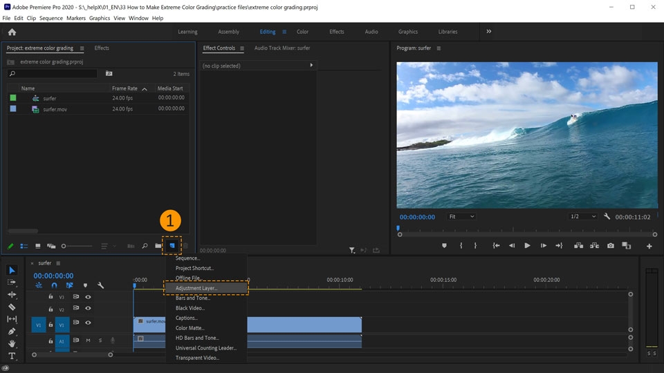 1. Download the practice file project and open it in Premiere Pro. On the Project Panel click the New Item button at lower right and choose Adjustment Layer from the dropdown list, then click OK.
