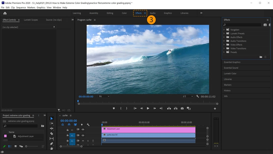 Tip: Instead of adding an effect directly to the video clip we have added an Adjustment Layer on top of the video, which allows us to apply the same effect to multiple clips on the Timeline.