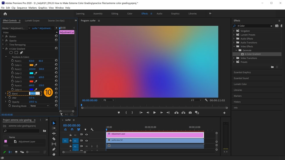 10. On the Effect Controls panel find the Blend setting within the 4-Color Gradient effect values. Increase the Blend value to create a softer border between colors, in this case, change it to 200.