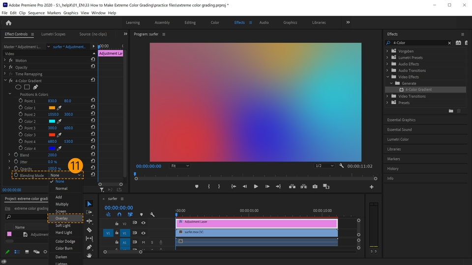 11. On the Effect Controls panel find the Blending Mode settings within the 4-Color Gradient effect values. Choose Overlay from the Blending Mode drop-down menu.