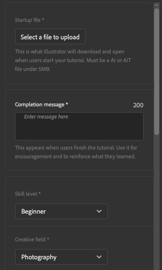 To access this Tutorial Builder Guide, while inside Illustrator, click the Question mark icon at the bottom of the panel. Or click your profile picture on the Home dashboard and click Go to Author Guide.