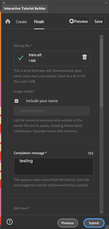 This section is a walkthrough of how to author your tutorial in the Tutorial Builder in Illustrator.