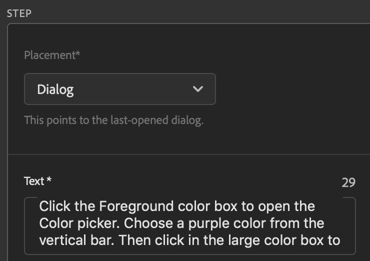 - In the Text field in Tutorial Builder enter your coach mark text, including an instruction to click OK to close the dialog box.