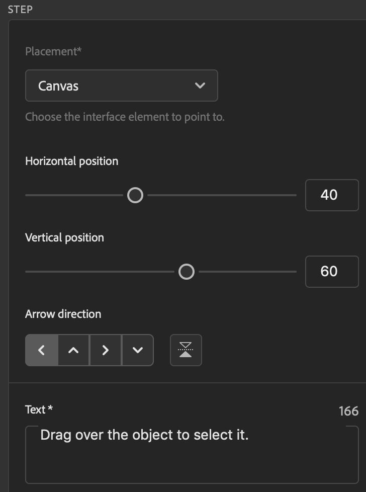 - Drag the Horizontal position and Vertical position sliders to position the coach mark where you want it on the canvas.