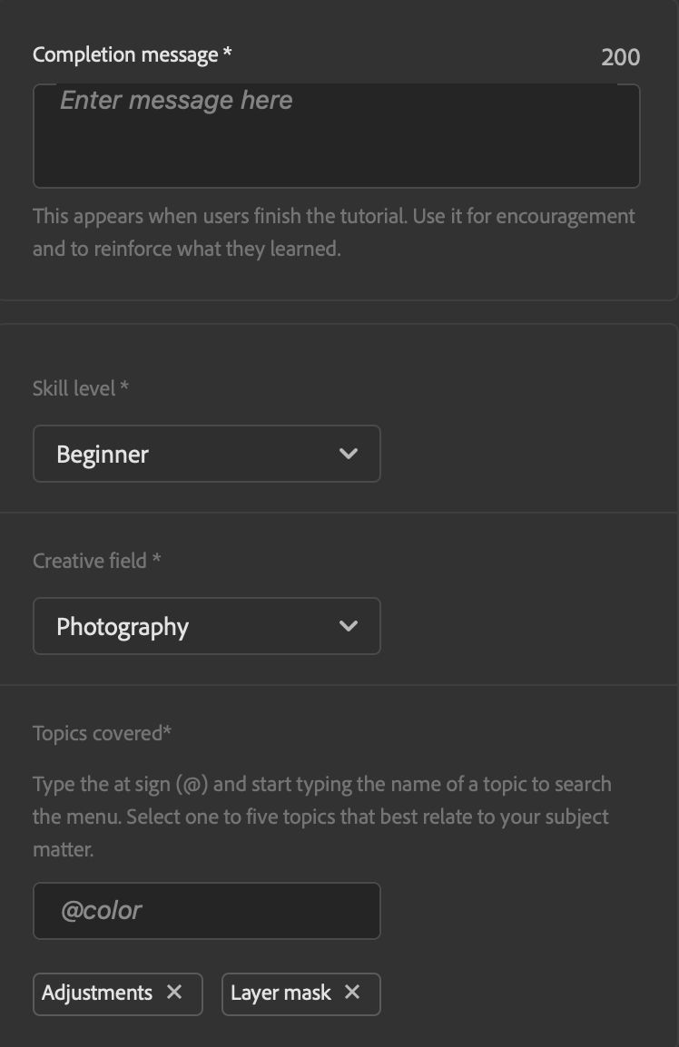 - Enter a Completion message that congratulates the user and summarizes what they learned in the tutorial. This is an important part of the learning experience for users!