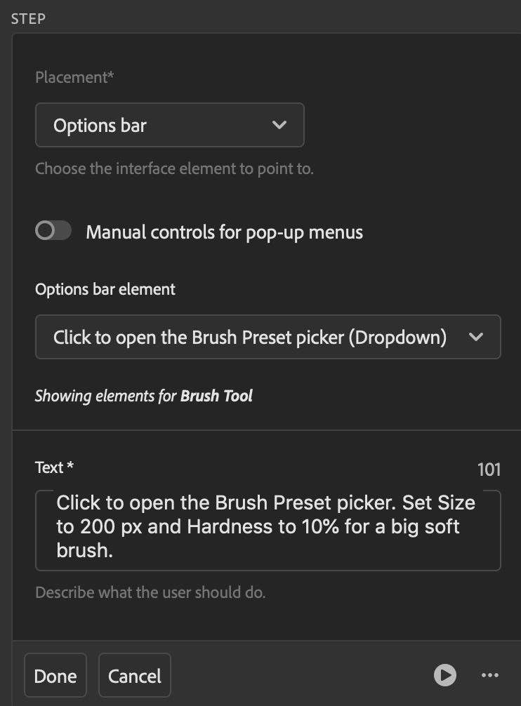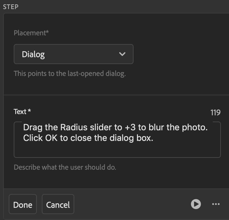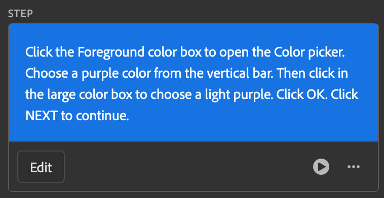 - The Play button to the right of the step will be on, so you can see a preview of this coach mark in Photoshop.