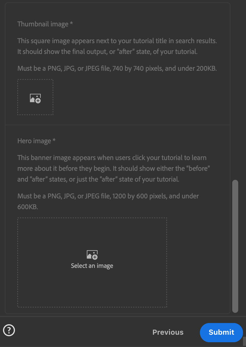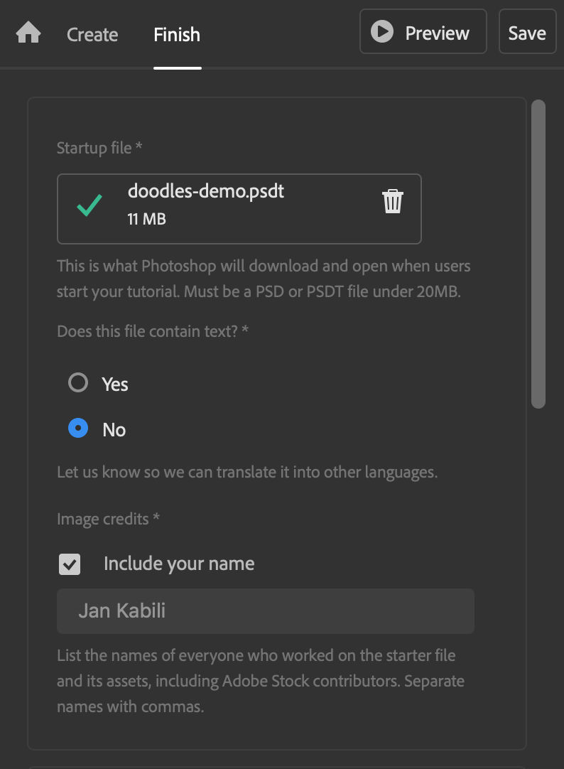 Important Tip: You cannot Preview your tutorial until you’ve uploaded your Starter file. You can jump to the Finish screen at any time to upload the Starter file.- For starter file requirements, see Asset guidelines and Image specs.