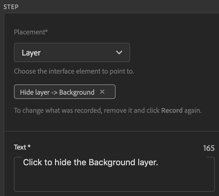 - Tutorial Builder guides you by displaying a Record button only if the Placement type you choose supports recording a coach mark.